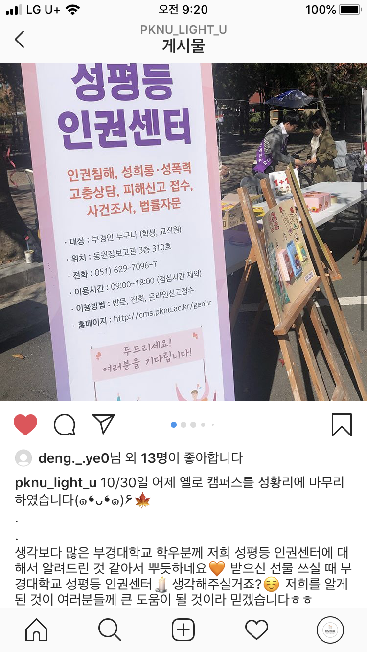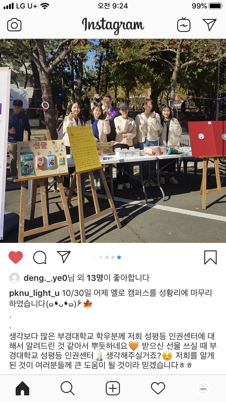 지난 10월 30일 부경학술문화제를 맞이하여 성평등인권센터 서포터즈 라이트유가 홍보 부스를 열였습니다. 많은 학생들이 참여하여 주셔서 감사합니다. 앞으로도 부경인의 인권보호와 성평등한 대학문화를 만드는데 앞장서는 라이트유가 되겠습니다.