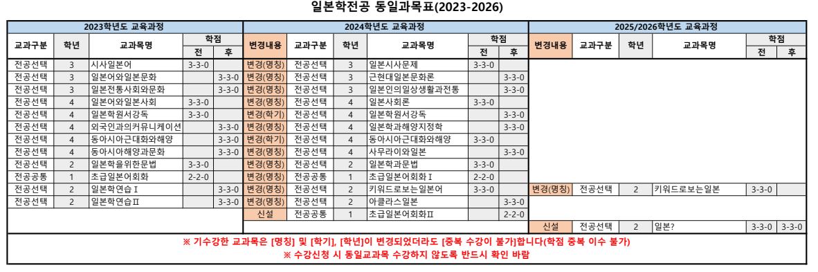 | 첨부파일 | 2026학년도 일본학전공 교육과정안.pdf 2026학년도 일본어문학전공 교육과정안.pdf 동일과목표(2023-2026).pdf | ||