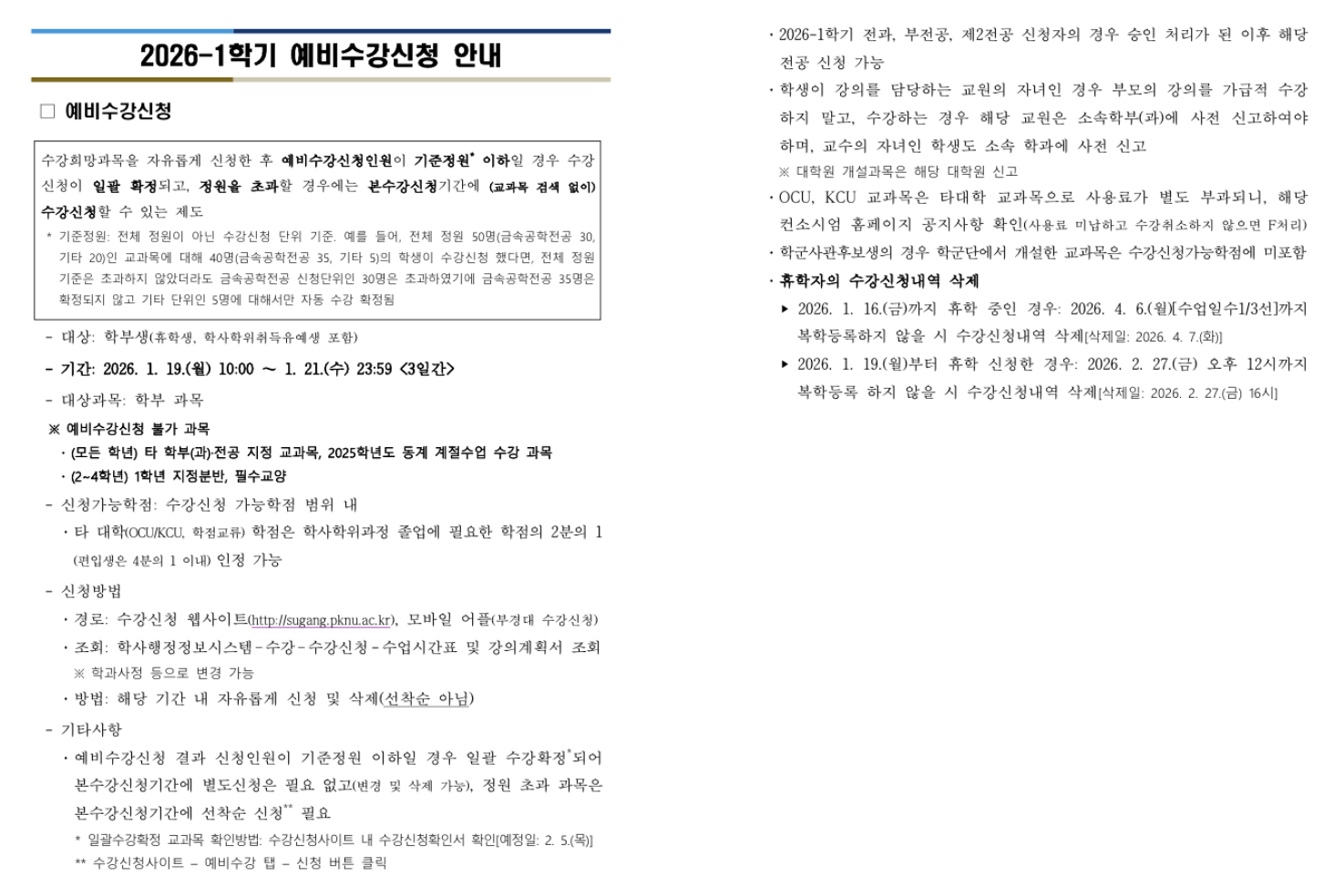| 첨부파일 | 예비수강신청 매뉴얼(2026-1).pdf 2026-1학기 개설교과목 현황(20260109 16시 기준)(안내용).xlsx 2026-1학기 강의편람.pdf | ||
